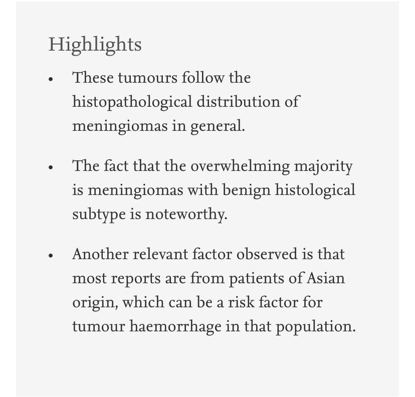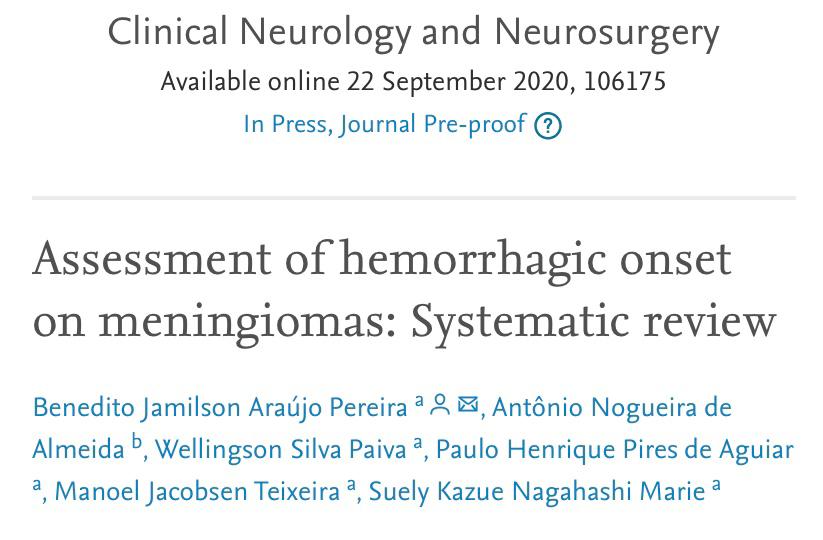 Neste estudo os autores realizaram Uma interessante discussão sobre hemorragia intra-tumoral em meningiomas – “bleeding meningioma”. Aspectos clínicos e prognósticos nos pacientes com essa apresentação inicial muitas vezes na unidade de emergência. Os resultados poderão ajudar milhares de pacientes em todo o mundo com meningiomas